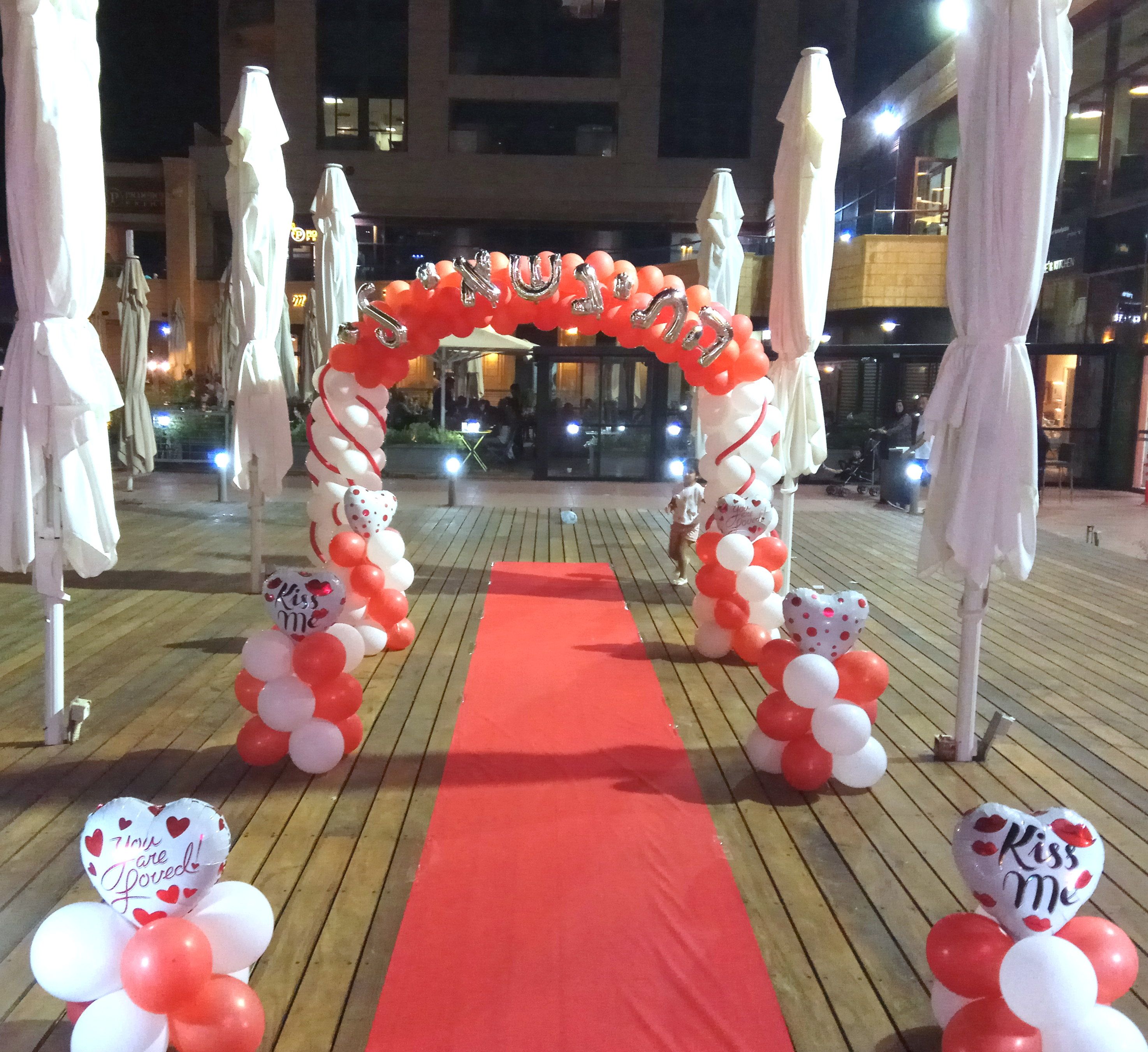 הצעת נישואין עם בלון טבעת ,אותיות באנגלית על הגשרMARRY ME ,לבבות כסף ובלוני הליום אדומים,שטיח אדום.בלון טבעת להצעת נישואין.